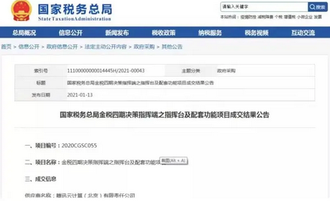 最近,国家税务总局发布金税四期决策指挥端之指挥台及配套功能项目成交结果公告: